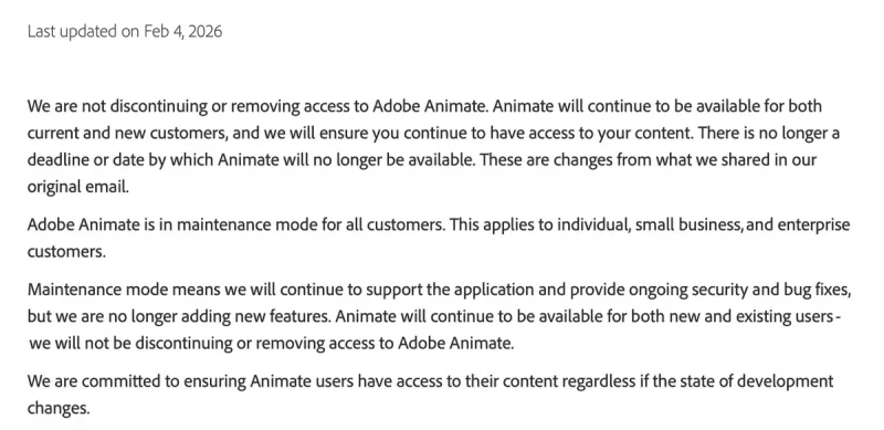今回の修正は、最初の案内からわずか1〜2日後に行われた。提供終了と受け取られかねない表現が広く拡散されたことで、長年Animateを使用してきたユーザーを中心に混乱が広がっていた。