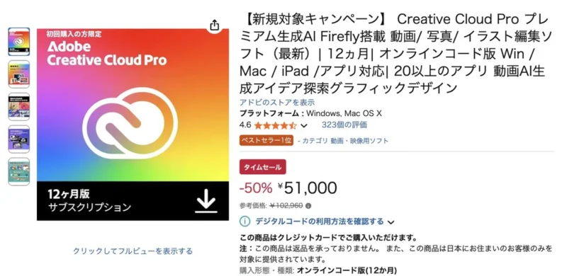 今回のセールは原則として「新規契約者のみ」が対象で、アドビ公式ストアでは既存ユーザーの買い直しは不可としている。しかし、Amazonでも同時にセールが行われており、その扱いが少し異なる。