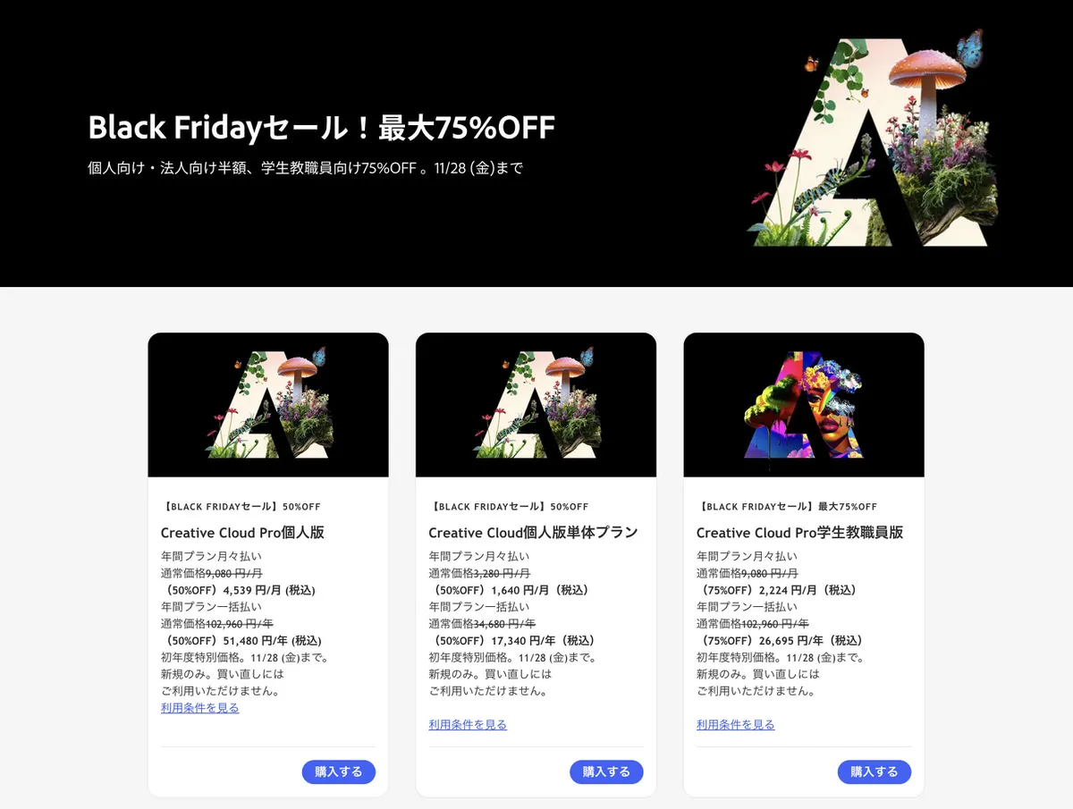 アドビが11月14日から28日までの2週間限定で「Black Friday Sale 2025」を開催している。