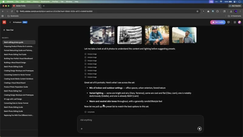 ベータ版では、チャット形式のインターフェースを採用。ユーザーは成果物のイメージや用途を文章で入力するだけで、Adobe Photoshop、Adobe Lightroom、Adobe Premiere Proなどを横断した処理が自動で進む。アシスタントは適切なツールを選択しながら、複数ステップの作業を順に実行する。