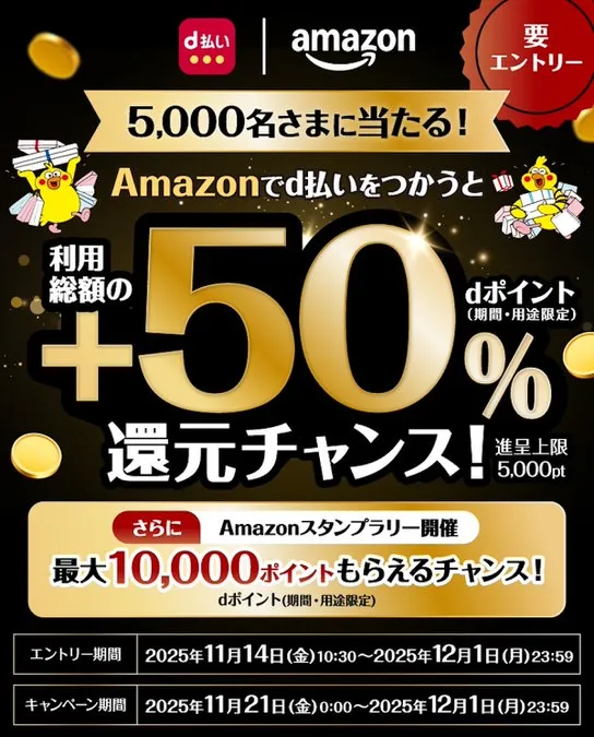 d払いに関連するキャンペーンも実施される。キャンペーンにエントリーし、Amazon.co.jpで合計5,000円以上を「d払い(電話料金合算払い)」で支払うと、抽選で5,000名に利用額の50%分のdポイントが還元される。