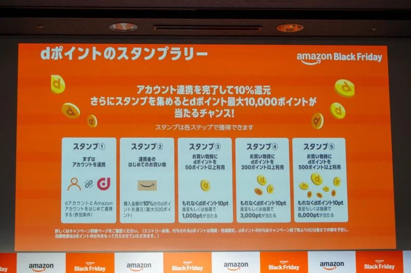 dポイントスタンプラリー」は、ブラックフライデー期間中にdアカウントとAmazonアカウントを連携し、買い物時にdポイントを利用すると、利用ポイント数に応じて最大1万ポイントが当たる抽選に参加できるというもの。
