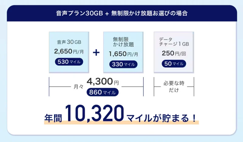たとえば、30GBの音声プランに無制限かけ放題を組み合わせた場合、月額4,300円で毎月860マイルが貯まる。新規特典を含めると、年間では1万マイル超の獲得も見込める。