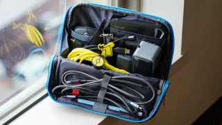 内部には複数のポケットや仕切りが用意されており、小型ガジェットを効率よく収納できる点がポイント。側面のボタンで固定することでポーチを開いた状態で自立させることも可能で、デスク上やイベント会場などでの利用にも適している。レビューはこちらから。