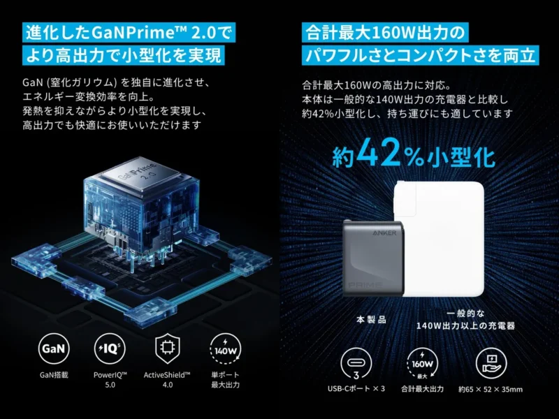 Anker独自のGaN技術が「GaNPrime 2.0」へと進化したことで、ICチップの変換効率が向上。発熱を抑えつつ、基盤レイアウトの自由度を高めることで、小型化と高出力化の両立に成功している。