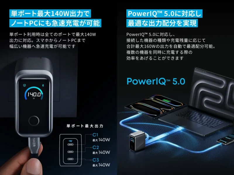 USB-Cポートを3基備え、単ポート最大140W、3ポート合計最大160Wの出力に対応。Anker独自の「PowerIQ 5.0」により、接続機器の種類や充電残量に応じて約2分ごとに出力を最適化し、複数デバイスを効率良く充電できる。