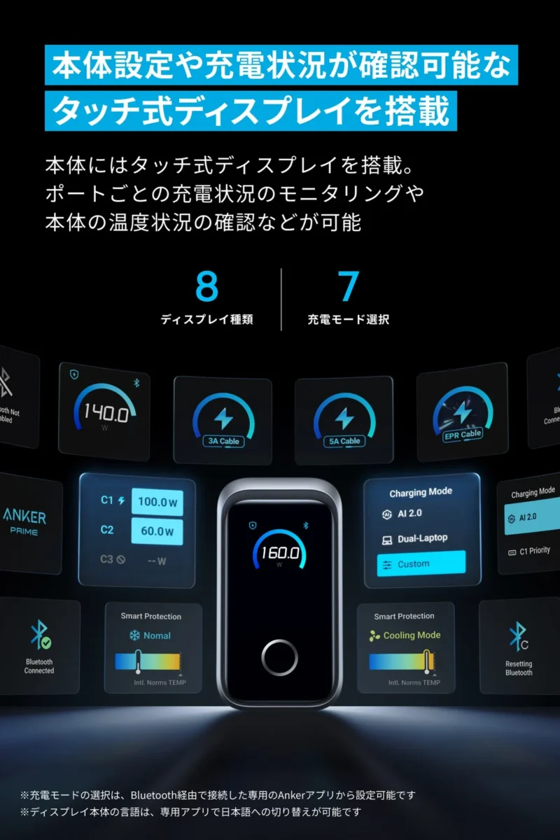 また、本体にはタッチ式ディスプレイを搭載。各ポートの出力状況や本体温度をリアルタイムで確認できるほか、タッチ操作で充電モードの切り替えも行える。