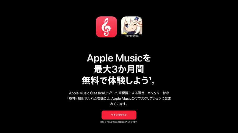 今回のリリースに合わせて、Apple Musicでは『原神』ファンやプレイヤー向けに最大3か月間のApple Music無料特典を提供している。
