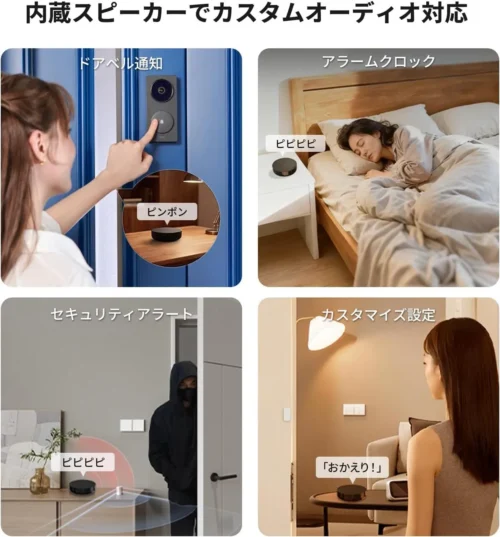 Aqaraセンサーと組み合わせれば、Matter対応の自動温度管理付きスマート機器としても利用できる。内蔵スピーカーも備え、ドアベル通知やセキュリティアラート、アラーム、カスタム音声メッセージなど、幅広い用途に対応する。