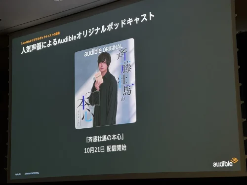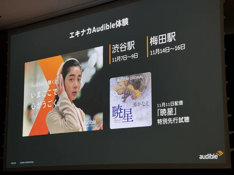 発表会の最後には、11月に実施する「エキナカAudible体験」についての案内があった。本イベントは駅という日常の中でAudibleを試すことができる日本初の大規模イベントで、それぞれ渋谷駅では11月7日〜9日、梅田駅では11月14日〜16日の期間中、11月11日に配信を開始する『暁星』を先行試聴できる。同期間中に渋谷や梅田を訪れる方は、ぜひ体験してみてはどうだろうか。