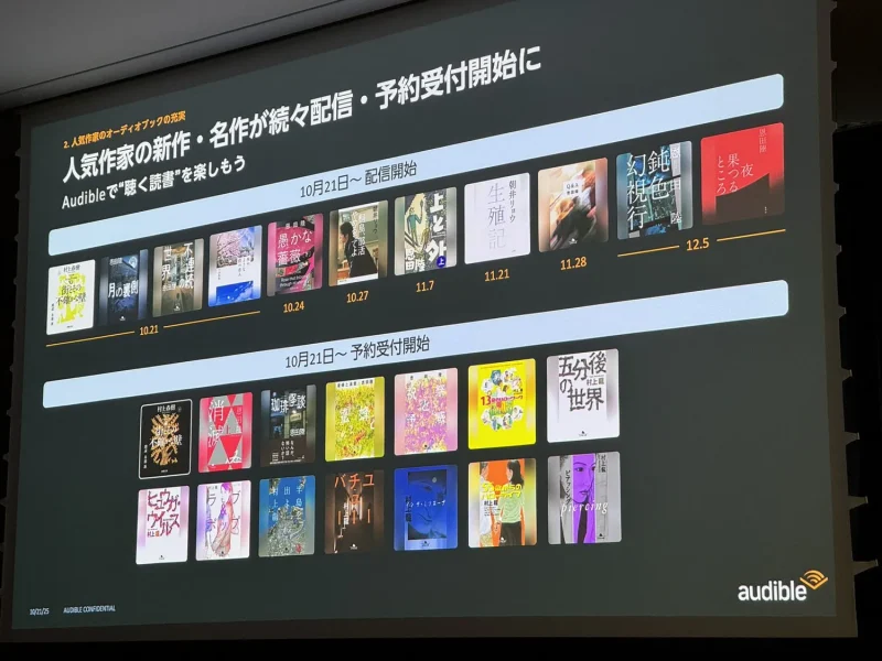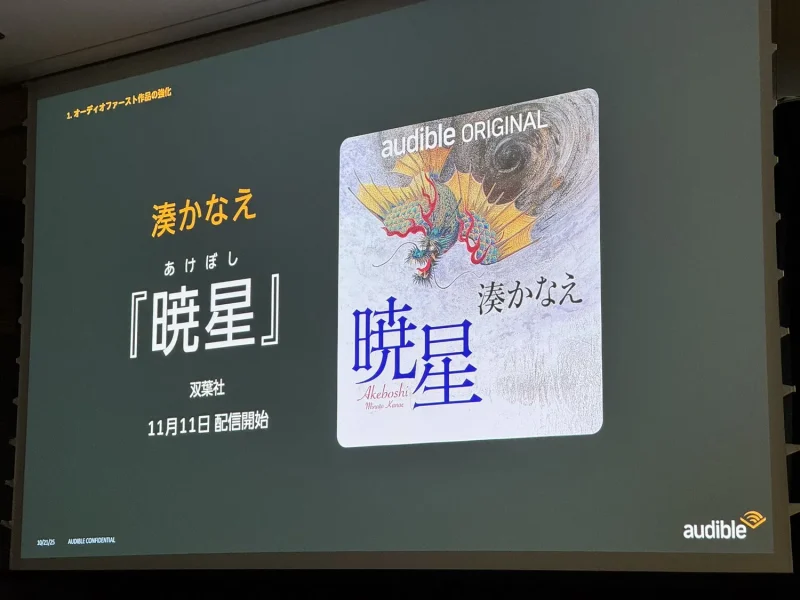 中でも注目は、独自制作シリーズ「オーディオファースト作品」に登場する湊かなえ氏の最新作『暁星』。人気声優の櫻井孝宏氏と早見沙織氏が朗読を担当しており、10月21日より予約受付を開始し、11月11日に配信を予定している。年明けには英語版『The Star at Dawn』も世界中で配信される。