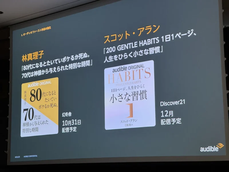 さらに、林真理子氏のオーディオファースト作品『80代になるとたいていボケるか死ぬ。70代は神様から与えられた特別な時間』が10月31日に、スコット・アラン氏の『200 GENTLE HABITS 1日1ページ、人生をひらく小さな習慣』が12月に配信予定と、話題作が続く。