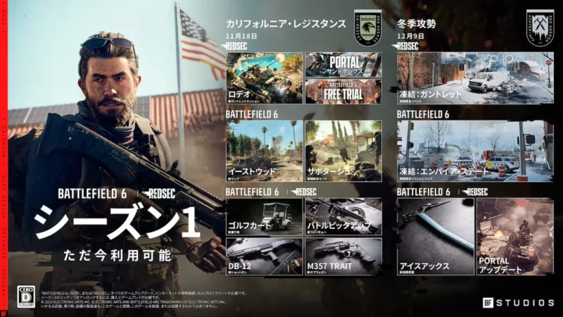「カリフォルニア・レジスタンス」の期間限定イベントは、『Battlefield 6』と『REDSEC』の両方で楽しめる。シーズン1のバトルパスと並行して進められるボーナスパスも用意されている。シーズン1の最終フェーズは12月10日午前1:00に「Winter Offensive」として開始され、特別な季節限定コンテンツが追加される。