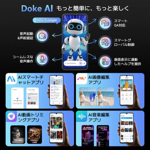 AI機能はより踏み込んでおり、ChatGPT、Gemini、DeepSeekをまとめて利用できる「Hi Doki App」をプリインストールする。チャットAI、検索、文章生成、画像生成の機能を一つのアプリに集約した構成で、スマホ初心者でも入りやすい。写真をAIで加工する「マジック写真」や、テキストから音楽を作る「Soundle App」など、独自の生成系アプリも複数搭載されている。