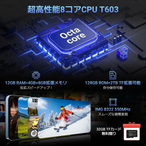搭載するプロセッサはUnisoc T603。8つのA55コアで構成され、最大1.6GHz動作のシンプルなチップだが、OS側の最適化が強めに効いており、ライトな操作であればストレスを感じにくい。RAMは4GBに加えて最大8GBの拡張に対応し、アプリの切り替えで息切れしにくくなる。