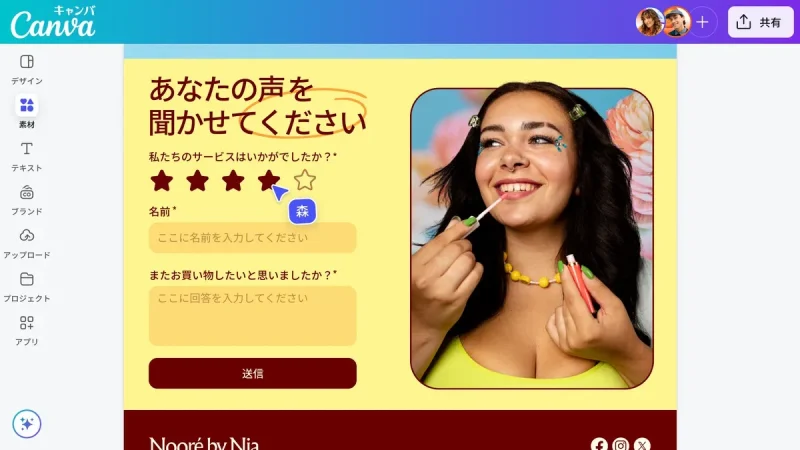- フォーム:Canva上で出欠確認やアンケートを作成し、回答結果を自動で「Canvaシート」に反映。ブランドデザインに合わせたフォーム作成が可能。