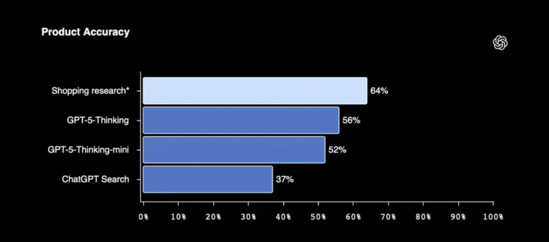 ショッピングリサーチには、ショッピング用途に特化して強化学習された「GPT-5 mini」が使われている。OpenAIの内部評価では、製品情報の正確性が64%に達し、従来のChatGPT Search(37%)を大幅に上回ったという。