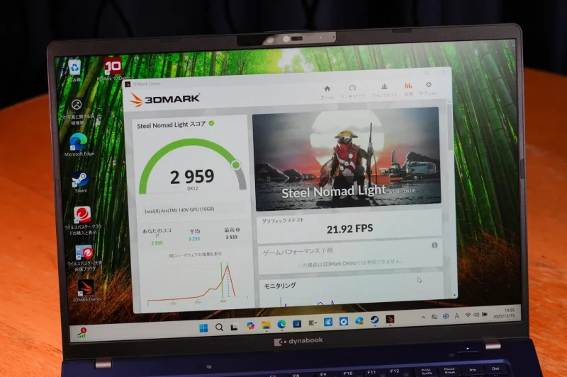 3DMark(Steel Nomad Light)のスコアは2959。この数値は、内蔵GPUとしては比較的高めの水準で、軽めの3D処理やグラフィックス性能を必要とする用途には十分対応できる性能を示している。