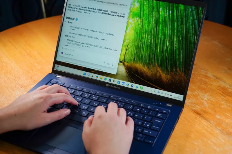 AI機能の活用をサポートするため、キーボードには押すだけでMicrosoft Copilotをすぐに呼び出せる「Copilotキー」を搭載。さらに、dynabook独自のAI機能として、ローカル環境でも文書の翻訳や要約を可能にする「dynabook AI アシスタント」が利用できる。