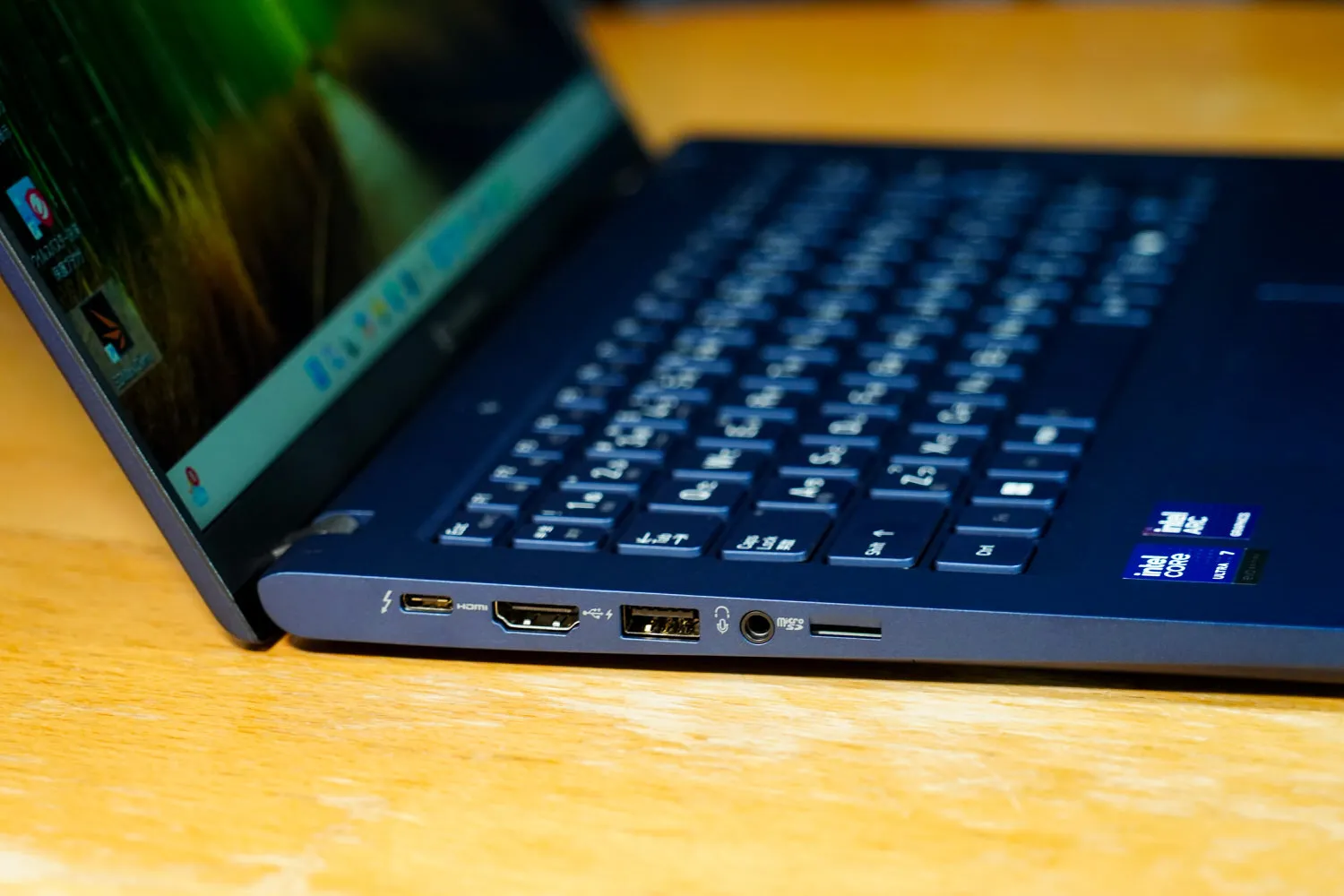 スリムボディでありながら、インターフェースの妥協はない。高速データ転送規格であるThunderbolt 4(USB4 Type-C、電源コネクタ、PD対応)コネクタ2基に加えて、USB 3.2(Gen1)Type-Aコネクタ×2、HDMI出力端子、有線LANコネクタ、microSDカードスロットを備えており、さまざまな機器とダイレクトに接続できる。HDMI出力端子は4K出力に対応する。