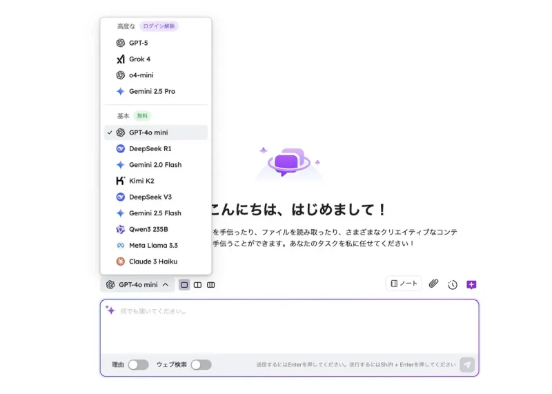 ログインなしの状態では、GPT-4o miniやGemini 2.5 Flash、Meta Llama 3.3などのAIモデルが選択できる。GPT-5やGrok 4、o4-mini、Gemini 2.5 Proなどの高度なAIモデルを使いたい場合は、アカウントを作成してログインすればこれらも使えるようになる。