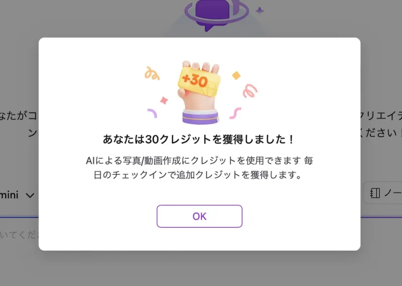 また、アカウント作成時には「高度なクレジット」を30入手することができる。高度なクレジットは写真・動画作成を利用するときに消費されるもので、AIと会話をするだけでは消費されないので安心していただきたい。ちなみに、「高度なクレジット」も有料で購入できるが、毎日のチェックインでも少しずつ獲得することが可能だ。