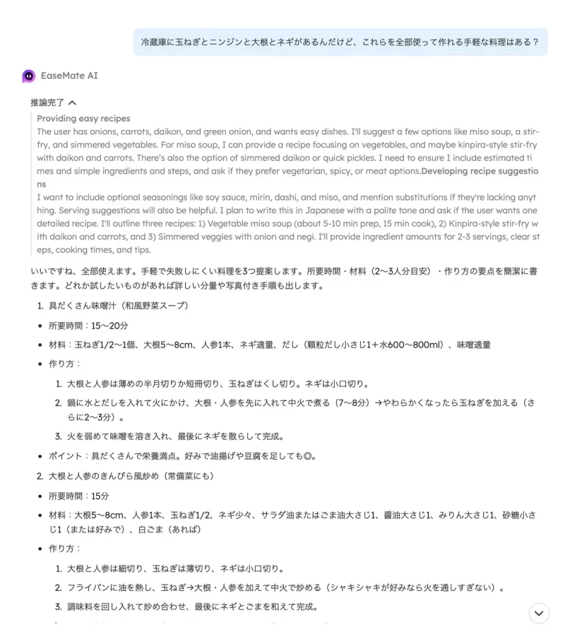 たとえば、筆者の自宅の冷蔵庫にある残り物の野菜を使って作れる料理について聞いてみたところ、調理方法も含めて4種類の料理を紹介してくれた。