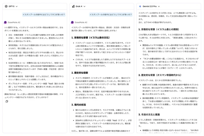 「EaseMate AI」のユニークな機能として、2つもしくは3つのAIモデルに同時に回答をお願いできる機能がある。それぞれの回答は横に並ぶように表示されるため、各AIモデルの回答の違いを比較することが可能だ。各AIモデルによって回答の傾向が異なるため、自分の質問内容に対して最も適した回答を一目で見つけられるというメリットもある。