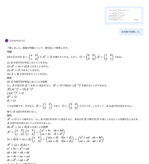 数学問題は、通常の「EaseMate AI」の方で回答をお願いすることもできるが、数式ソルバーの方が計算式が読みやすくなっていてオススメだ。まるで問題集の回答を読んでいるような感覚で解法を確認できる。