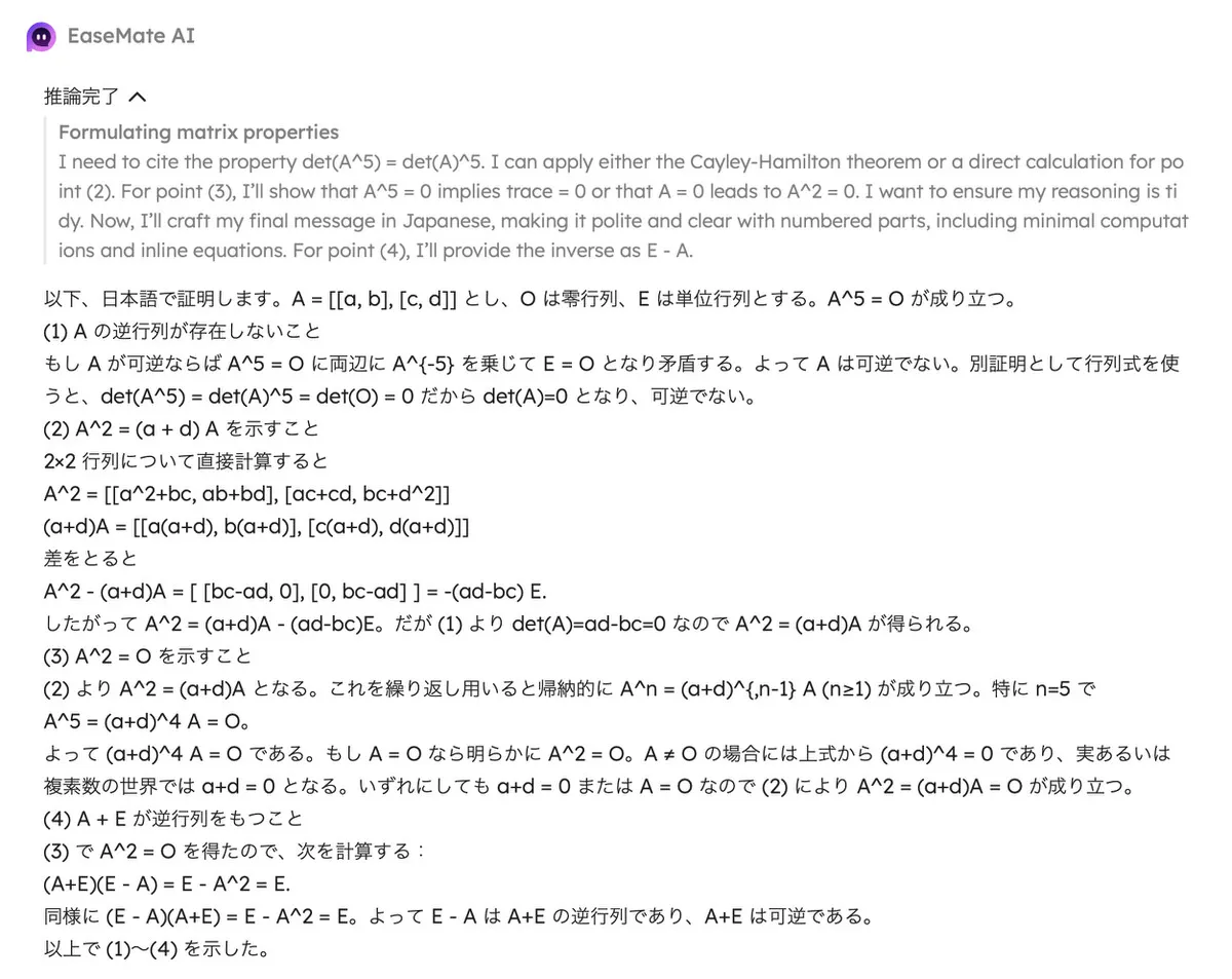 数学問題は、通常の「EaseMate AI」の方で回答をお願いすることもできるが、数式ソルバーの方が計算式が読みやすくなっていてオススメだ。まるで問題集の回答を読んでいるような感覚で解法を確認できる。