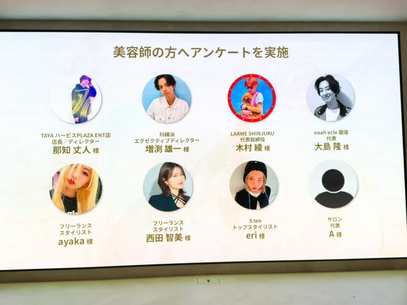 会場では、サロン代表やスタイリスト8名を対象としたアンケート結果も公開された。既存の高機能ドライヤーを基準とした5点満点評価では、「操作性(軽さ・持ちやすさ)」が4.5点、「風量」が4.25点と高い評価を獲得。全員が手首や腕への負担軽減を実感しており、長時間でも扱いやすい設計が裏付けられた。