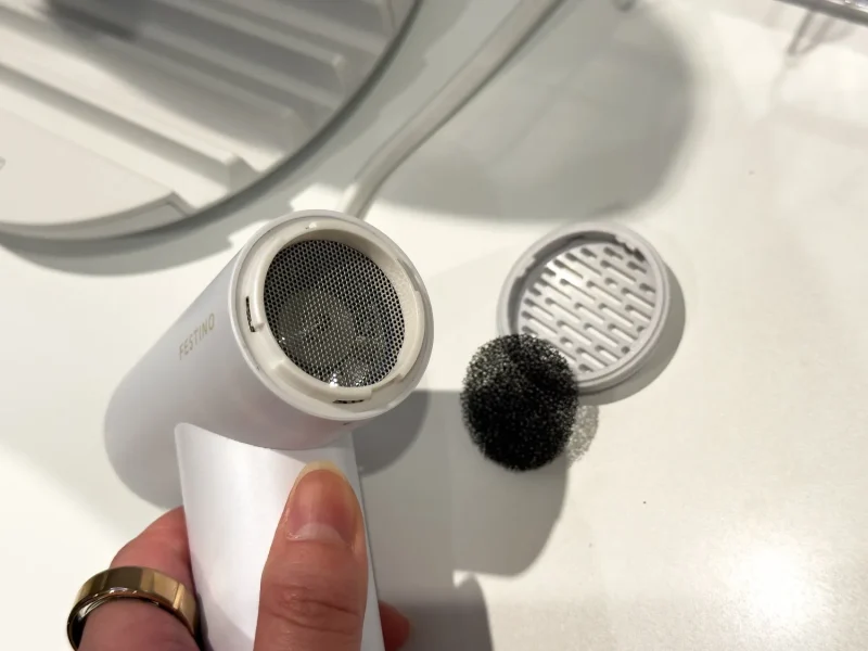 一方で、小型化に伴うパワー不足への懸念に対しては、風の設計そのもので応えている。開発段階で重視したのは、風速・風圧・風量のバランスだ。最大風速は毎秒33mに達し、小型ボディながらしっかりと根元から毛先まで風と熱を届ける。風量を増やすのではなく、効率よく風を当てることで乾燥時間の短縮につなげている。