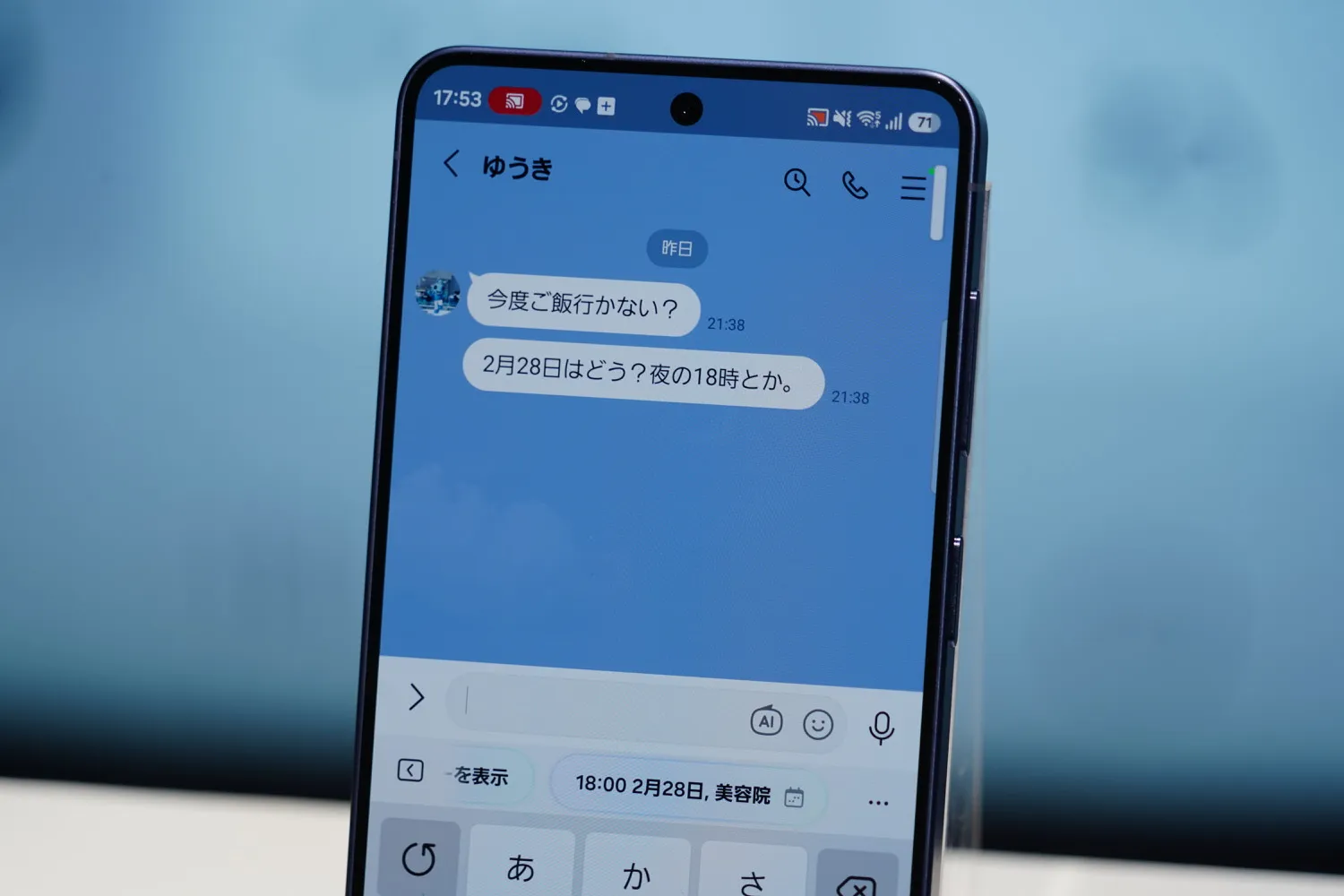 「ナウナッジ(Now Nudge)」は、メッセージアプリでのやり取りをAIが解析し、カレンダーの予定確認やギャラリー内の最適な写真の提案などを、アプリを切り替えることなく提示・実行する機能だ。会話内容に応じて関連するアクションをその場で提示することで、操作の手間を大幅に削減する。
