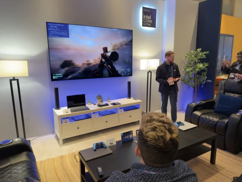 このラウンジは、Panther Lakeの将来像を語る場というより、すでに動作する実機を通じて「現時点で何ができるのか」を体験させることに主眼を置いた空間だ。Arc B390 GPUを内蔵するCore Ultra X7 358HやX9 388HといったSeries 3搭載システムが並び、ゲーム性能やAI処理、バッテリー駆動を前提とした複数のデモが披露されていた。