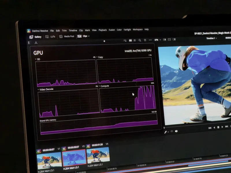 AI機能「Magic Mask」を使い、スケートボード選手の映像から上着部分のみを自動で切り抜き、色を変更する様子が紹介された。このデモは、Panther Lake世代のGPUがAI処理を含むクリエイティブワークの中心を担えることを、具体的に示すものだった。