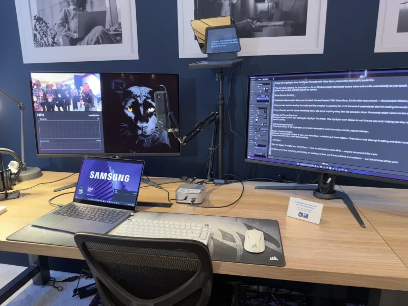 続いて紹介されたのが、Samsung Galaxy Book 6 Pro(Core Ultra X7 358H)を用いた「Elgato Prompter + Voice Sync」デモだ。NPU(Intel AI Engine)を活用し、話者の声に合わせてプロンプターの表示を自動調整する仕組みとなっている。