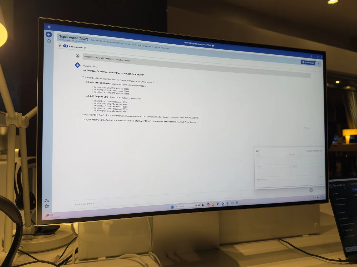 デモでは、Alibabaの大規模言語モデル「Qwen3-30B-A3B」(約300億パラメータ級)を、Arc B390 GPUに内蔵されたXMXユニットを使って完全にローカル実行した。その上で、Intel AI Assistant Builderで構築した「Super Agent」(複数の専門AIエージェントが連携する仕組み)と、MCP(Model Context Protocol)によって外部ツールやデータをリアルタイムに呼び出し、RAG(検索拡張生成)を組み合わせて正確な回答を生成していた。