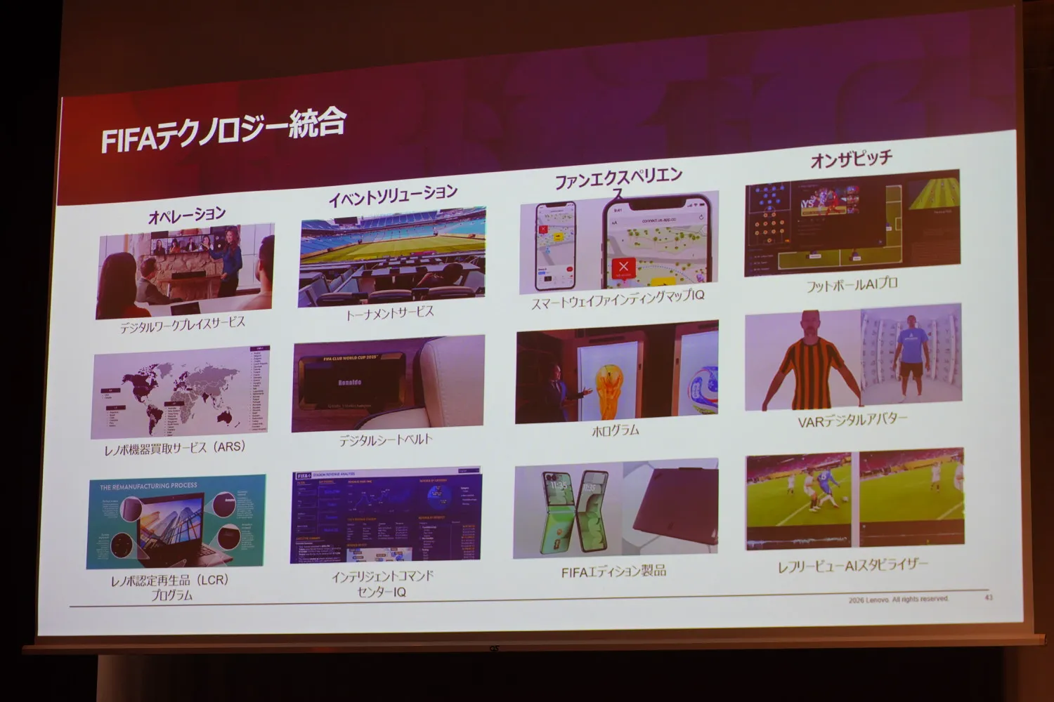 スポーツ分野では、FIFAの公式テクノロジーパートナーとして、2026年男子ワールドカップおよび2027年女子ワールドカップでのAI活用を支援する。3Dリアルタイム再構成技術によるVAR高度化や、審判用カメラ映像の補正、会場運営を最適化するデジタルツイン基盤などを展開する予定だ。