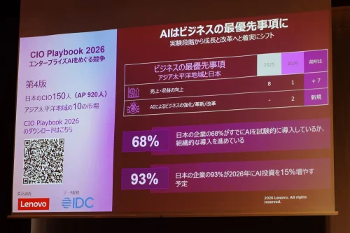 レノボ・ジャパンは2月17日、東京で「Lenovo Tech World Japan 2026」を開催し、企業向けAIの最新動向をまとめた調査レポート「CIO Playbook 2026:エンタープライズAIを巡る競争」を公開した。