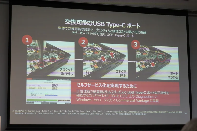 今回の刷新では、ThinkPadの特徴でもあるメンテナンス性にも改めて手が入れられている。メインストリームの「Tシリーズ」では、故障リスクの高いUSB Type-Cポートをユーザー自身で交換できる設計を採用。