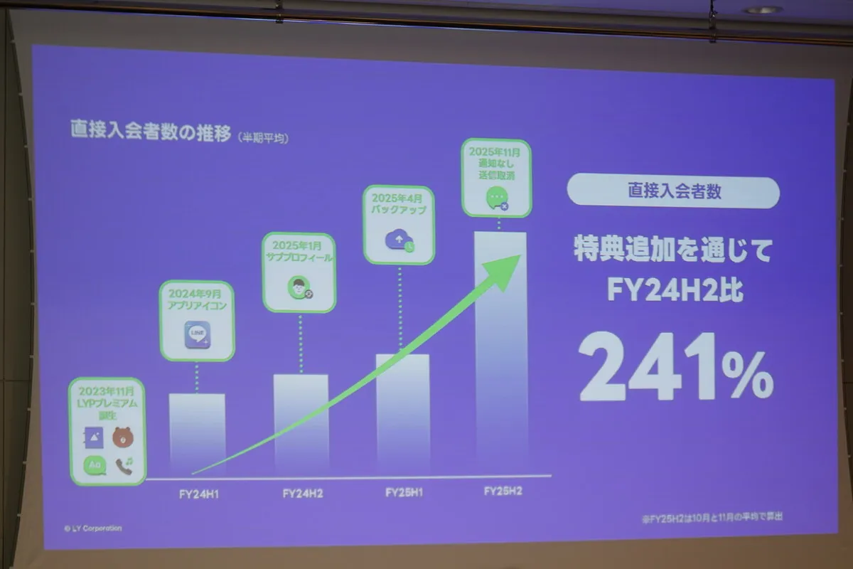 サービス開始から特典を拡充してきたことによって、FY24H2比で241%増とユーザー数が順調に伸びており、現在の加入者数はLINEヤフーグループで2466万人、直接加入者は551万人となっている。