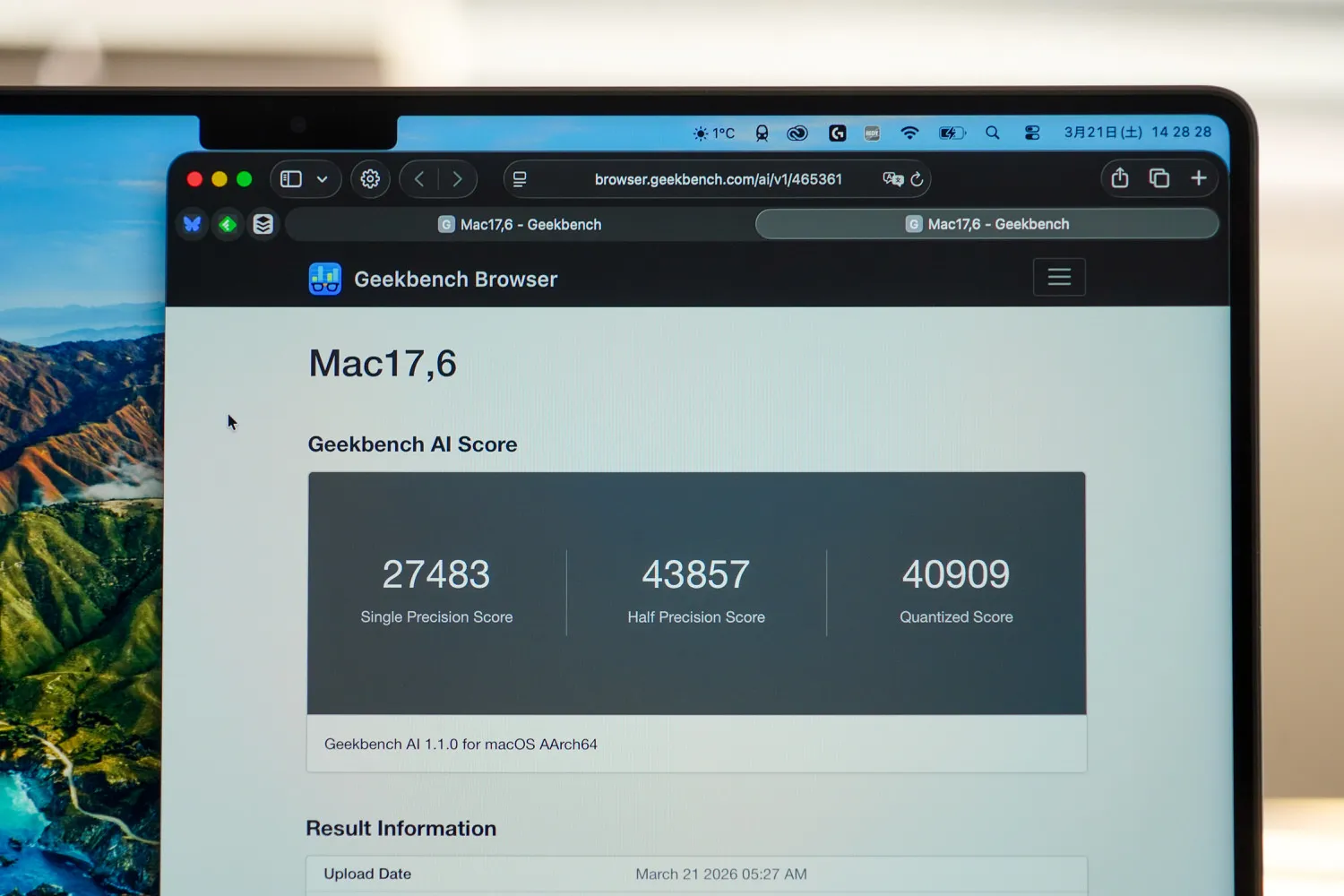 AIベンチマークでもGPUスコアが大きく伸びており、このチップがどの用途を見据えているのかは明らかだ。動画編集の高速化というよりも、「AI処理をローカルで完結させる」ことに重点が置かれている。もっと言うと、M5 Maxは「重い作業を速くするチップ」ではなく、「これまでできなかった作業を可能にするチップ」へと進化しているとも捉えることができるだろう。
