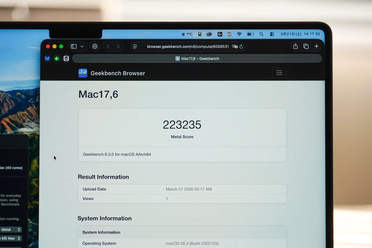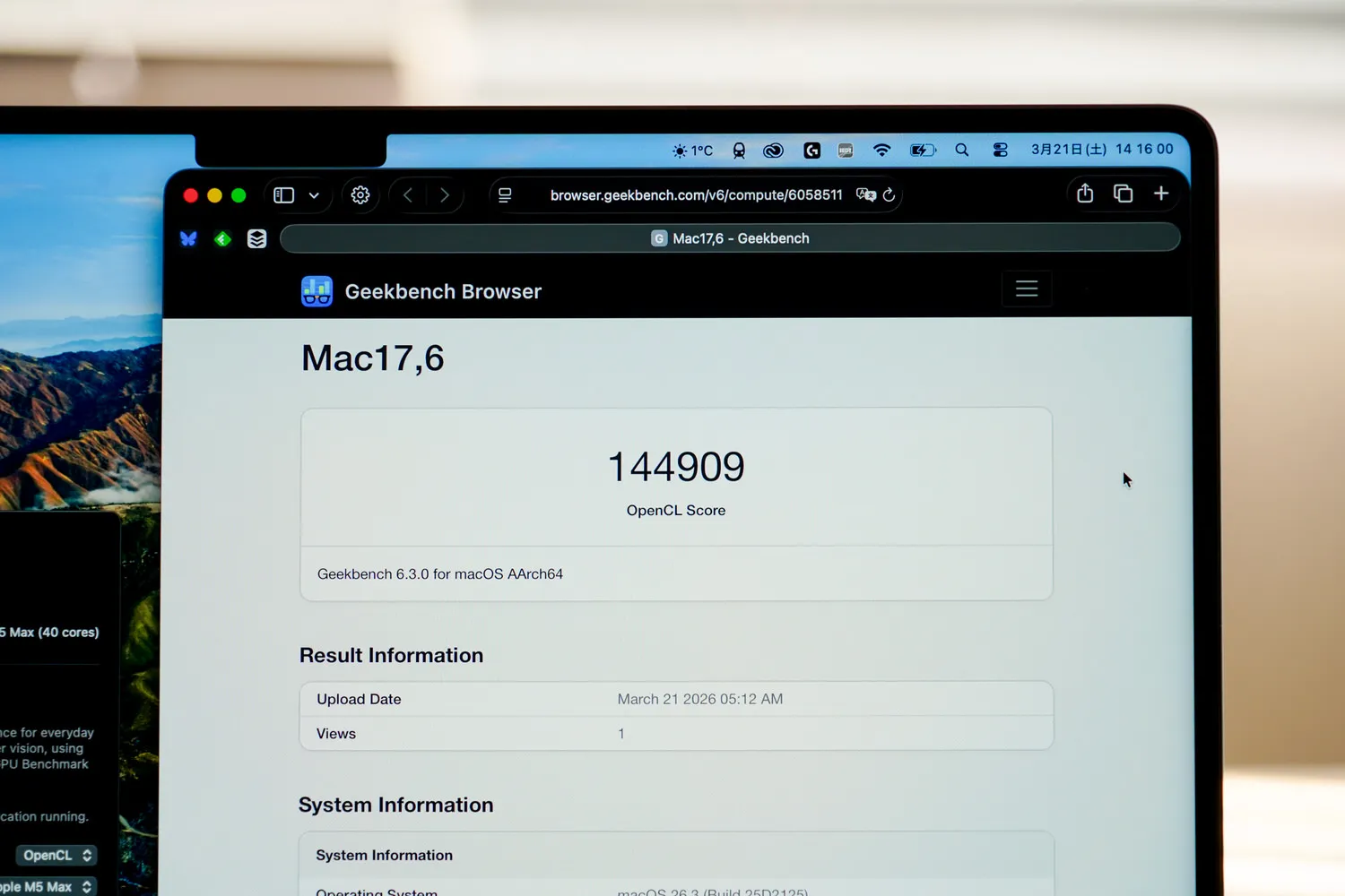 M5 Maxは、18コアCPUと最大40コアGPUを備えるAppleシリコンの最上位チップだ。ベンチマークでもその実力は明確で、「Geekbench 6」ではCPUマルチコア約2.9万、GPU(Metal)スコアは22万超という、モンスタースペックらしい結果になった。