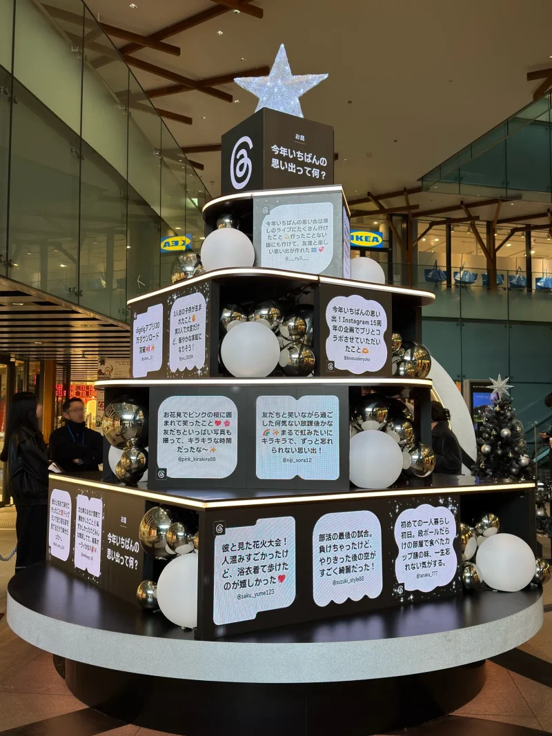 高さ数メートルのThreadsツリーの上部には、「今年いちばんの思い出って何?」「2025年でいちばんリピ(リピート)った曲は?」などのお題が表示されている。