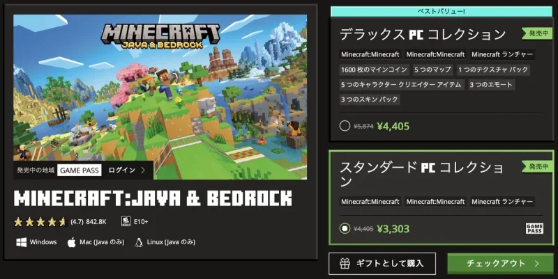 PC版の「Java & Bedrock Edition」は、MOD対応に強いJava版と、クロスプレイが可能なBedrock版を1本で利用できる構成だ。この定番エディションが3,000円台前半まで下がるのはかなり珍しい。