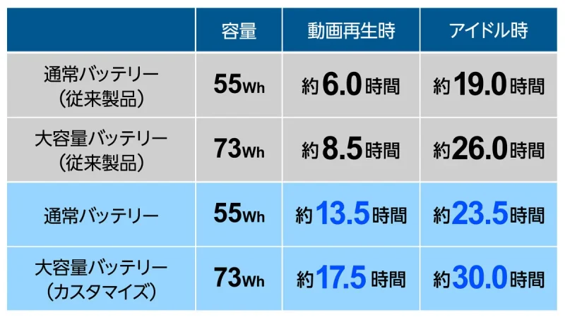 バッテリーは標準で55Whを搭載し、動画再生時で約13.5時間、アイドル時で約23.5時間の駆動を実現する。BTOオプションでは73Whの大容量バッテリーも選択でき、外出先での利用時間をさらに延ばすことが可能だ。