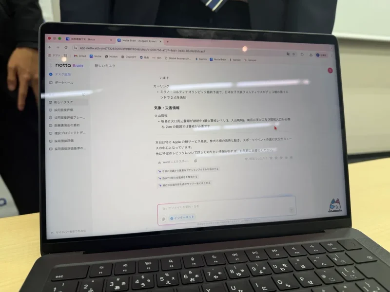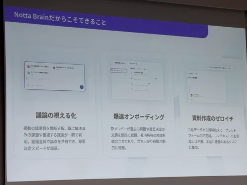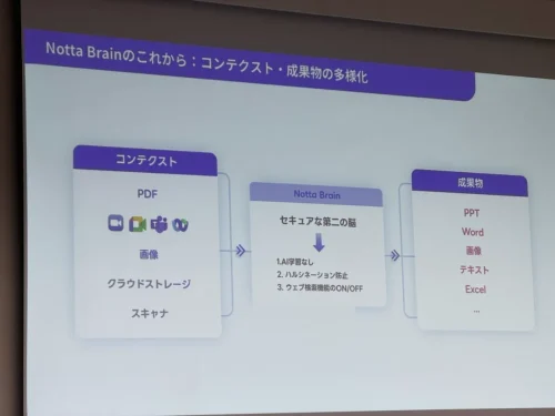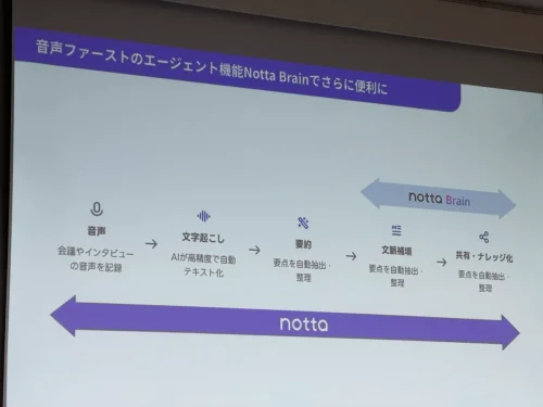 同社は調達資金を、ハードウェアを含むエコシステムの構築、法人顧客向けの支援体制強化、そしてAIを軸としたソフトウェア開発に重点投下する。中でも戦略の中核に据えるのが、同社初の本格AIエージェント「Notta Brain」だ。