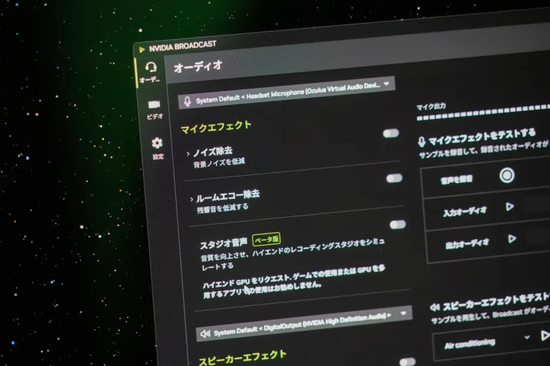 また、「NVIDIA Broadcast」では従来からノイズ除去や反響抑制といったAI処理が用意されている。加えて、ベータ機能の「Studio Voice」は、音声の周波数特性を補正し、よりクリアで聞き取りやすい音に整える機能だ。高価なマイクや防音環境がなくても、実用的な品質まで引き上げられる設計になっている。