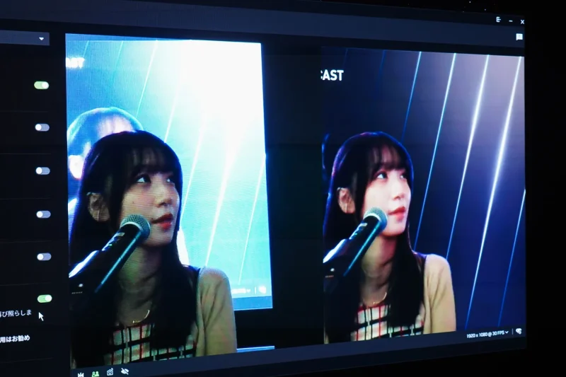上記は、左側が通常のカメラの映像、右側が同機能をオンにした映像だ。会場は全体的に暗めで、照明が十分とは言えない環境だったのだが、左右の映像を比較すれば分かるとおり、顔まわりだけが自然にライトアップされ、表情がハッキリ見える状態に整えられていた。