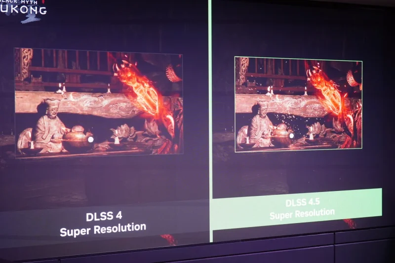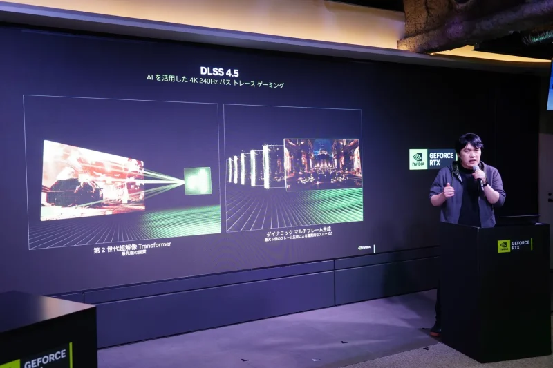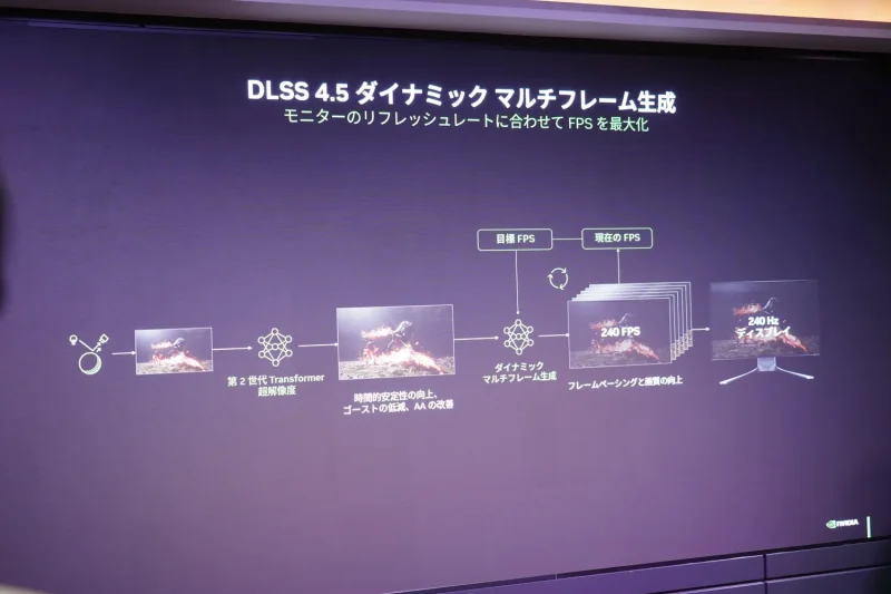 今回のイベントで大きな注目を集めたのが「DLSS 4.5」だ。プレゼンでは、第2世代トランスフォーマーモデルの採用により、画面全体の関係性を踏まえた描画が可能になったと説明された。